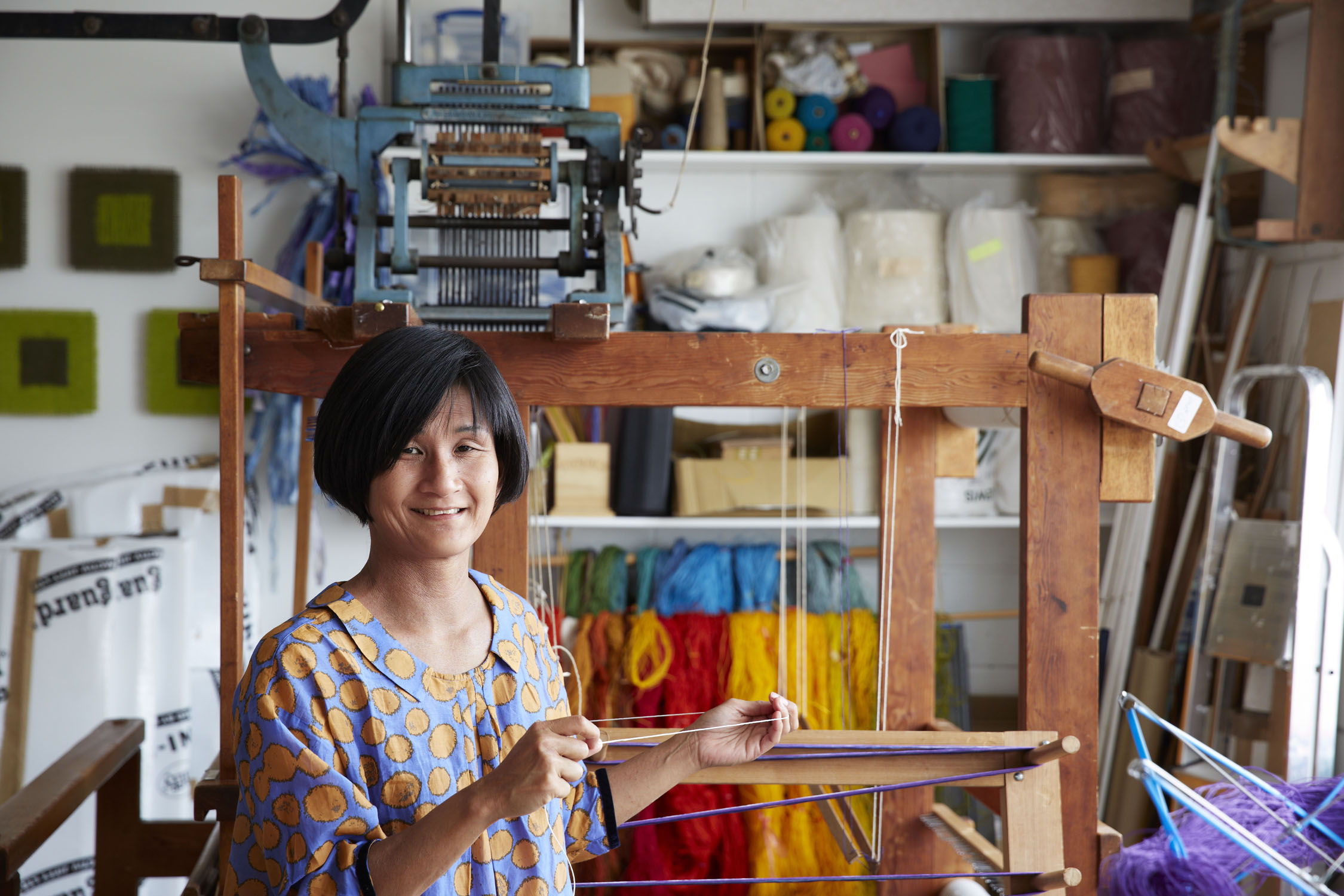 Working at her huge dobby loom, Seiko creates yarn sculptures inspired by nature that are full of calm and beauty.
