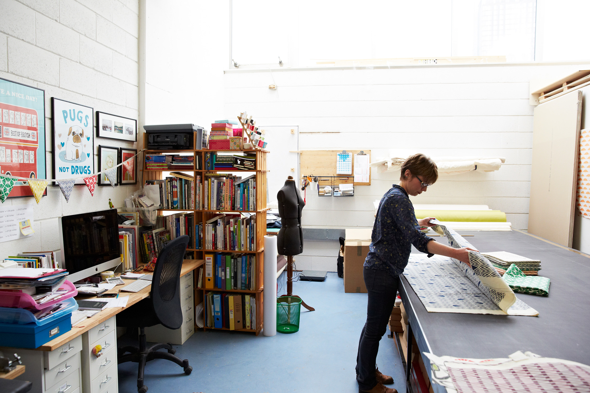 Peek inside fabric designer and screen printer Sarah's Yorkshire Artspace studio, shared with pugs Lola and Ethel.