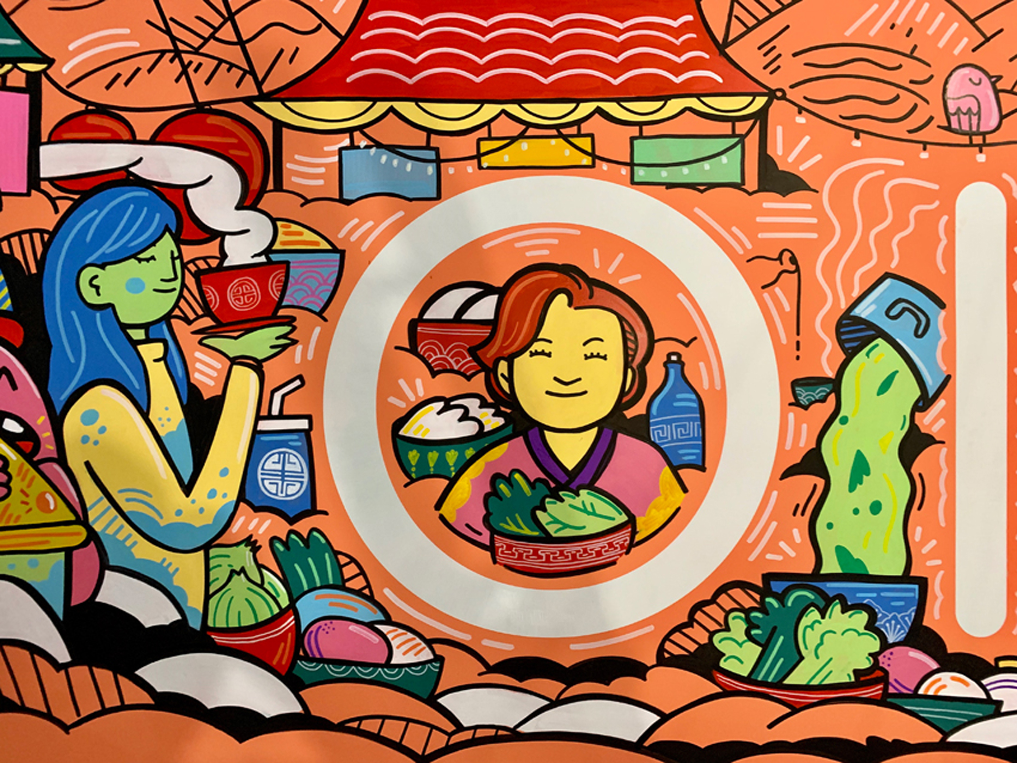 I’ve been working on an exciting piece for a new Asian food market called Oisoi Oriental Market. It’s a 13-metre feature mural with plenty of colour, character and narrative to sink your eyes into. It’s one of my most colourful mural works – I tend to keep colour to a minimum but this was a case where the client wanted to use a wider palette and I felt obliged to take up the challenge. Other than that I’ve been teaching part time at Sheffield Hallam University across Illustration and Digital Media Production as well as working on personal doodle works and occasional commissions that are building up in the background.