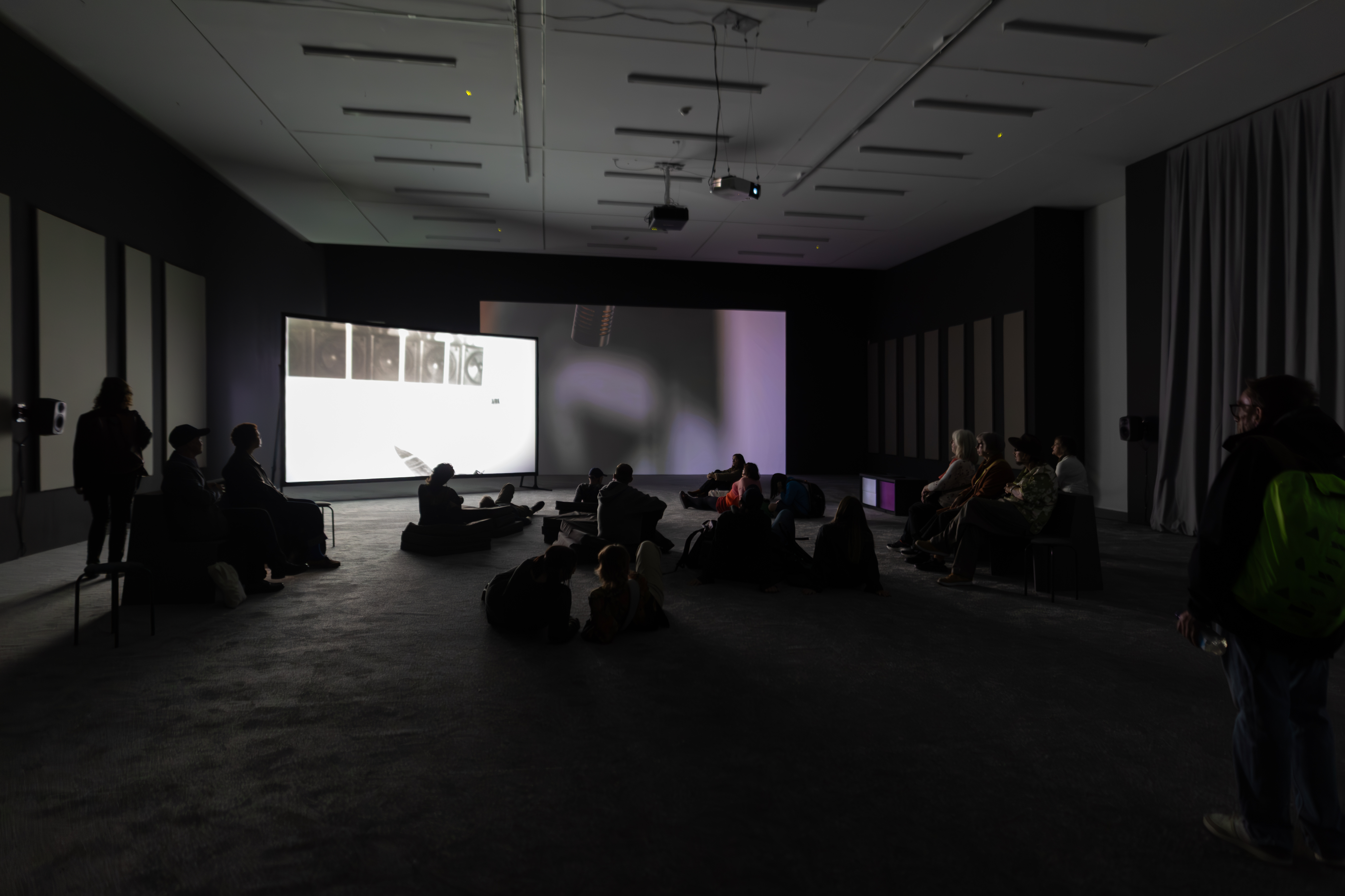 Haphazard seating is arranged in the centre, with screens of varying sizes enveloping you. Cushions and benches of different heights and levels all play into the improvisational nature of the space. Rather than feeling imposing, this arrangement reflects the mixed abilities of the work's contributors. The message is not immediately obvious, and it isn’t meant to be. Through interacting with these architectural arrangements, the struggle of Boakye-Yiadom’s project meets you where you are.