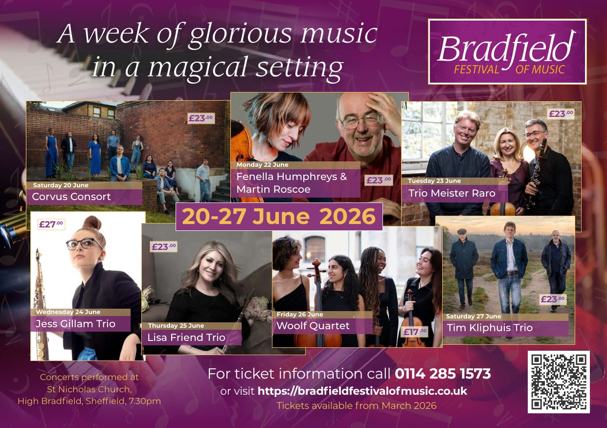 Join us this summer in Bradfield for a week of outstanding music from top international artists. There will be music ranging from classical to film, jazz and beyond, with artists keen to break down barriers and communicate in engaging new ways. All concerts are held in the medieval St Nicholas’ Church, High Bradfield with its wonderful acoustic and spectacular views over Peak Park countryside. There is something really special about a summer evening of music in this magical setting.