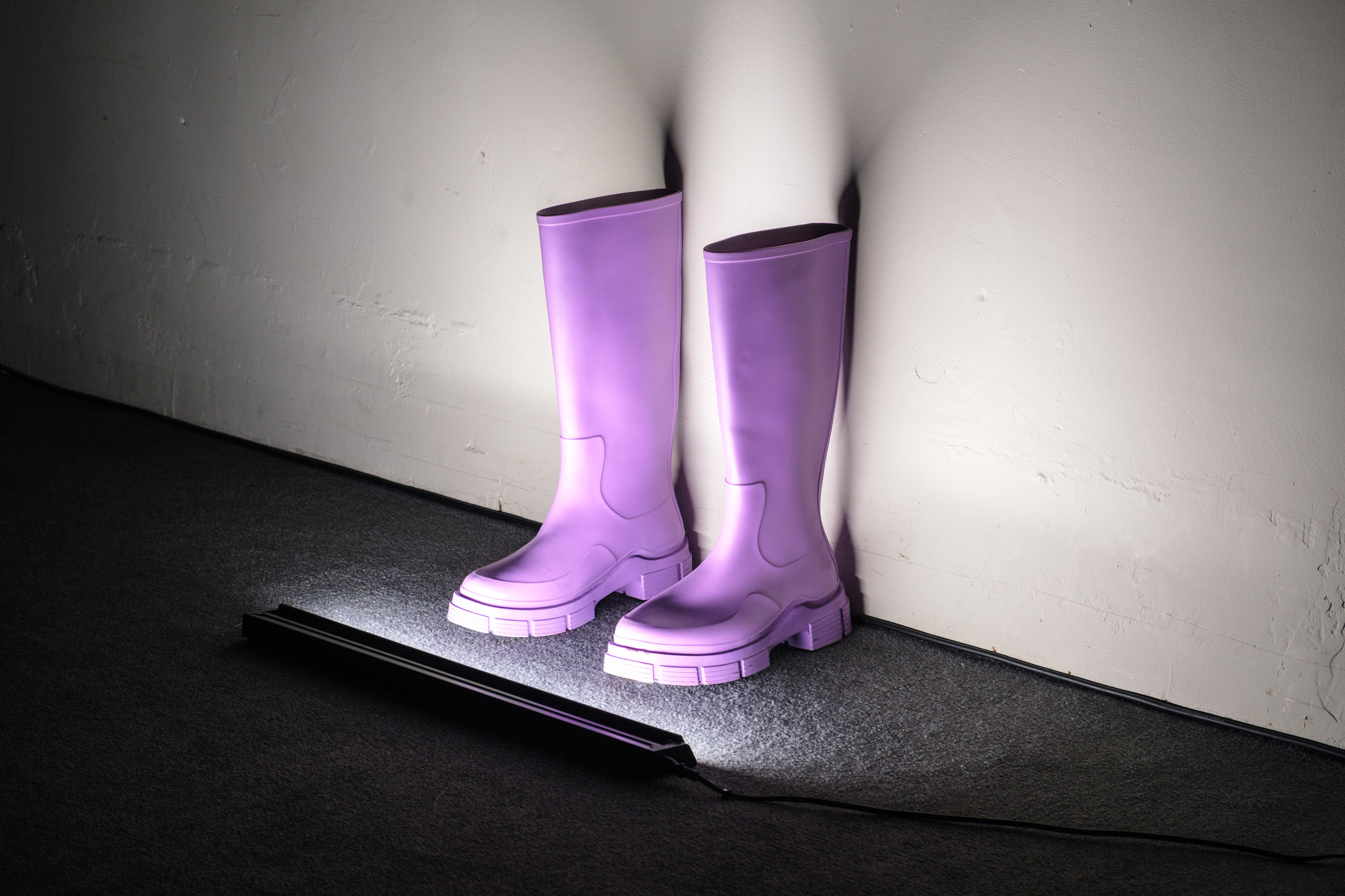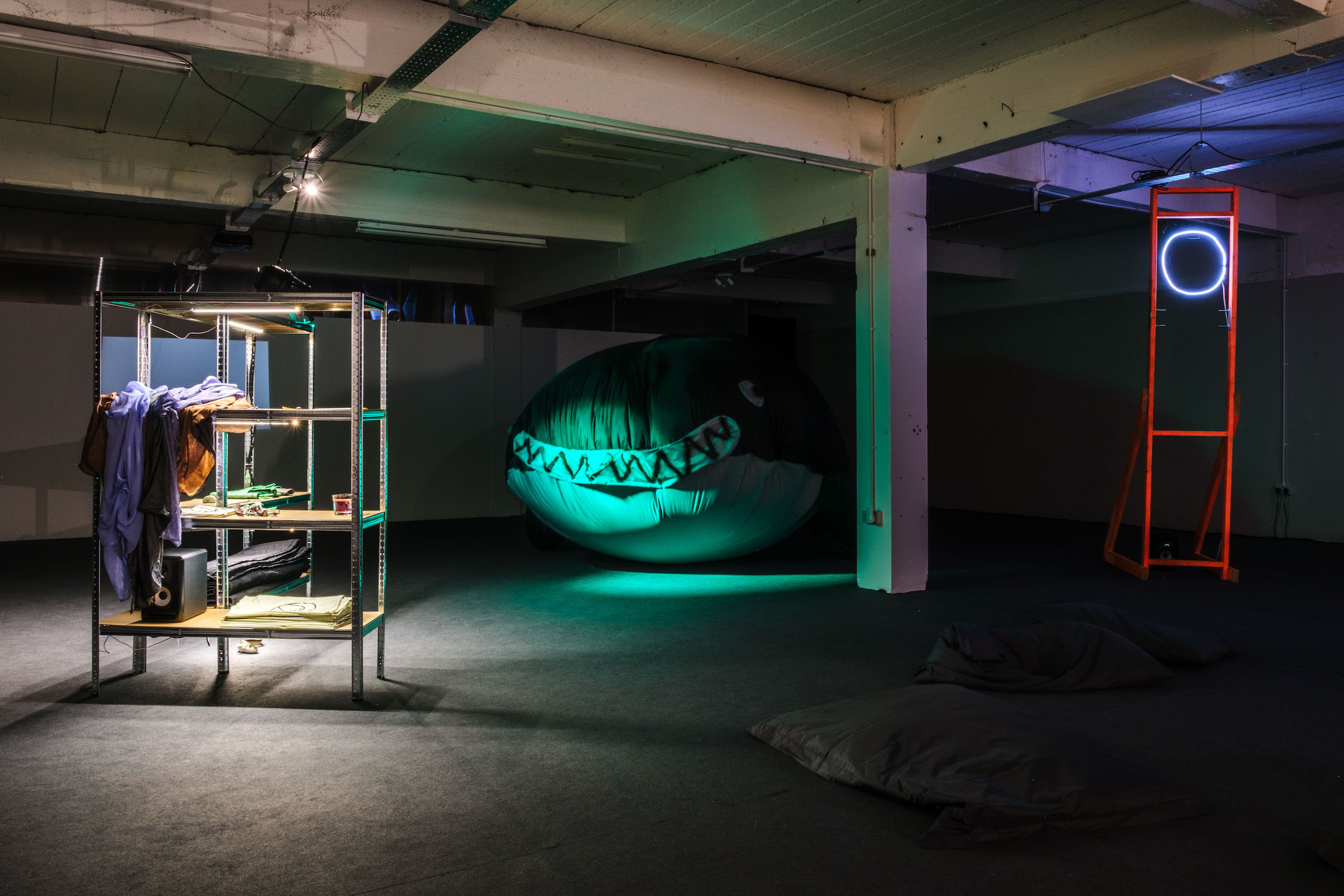 But the final piece of absurdity? A vast catfish inflating and deflating in an endless futile cycle. Its form imposing and dominating the space. Close by are a pair of lilac wellingtons. They are illuminated imposingly with the reverence of a religious icon.
