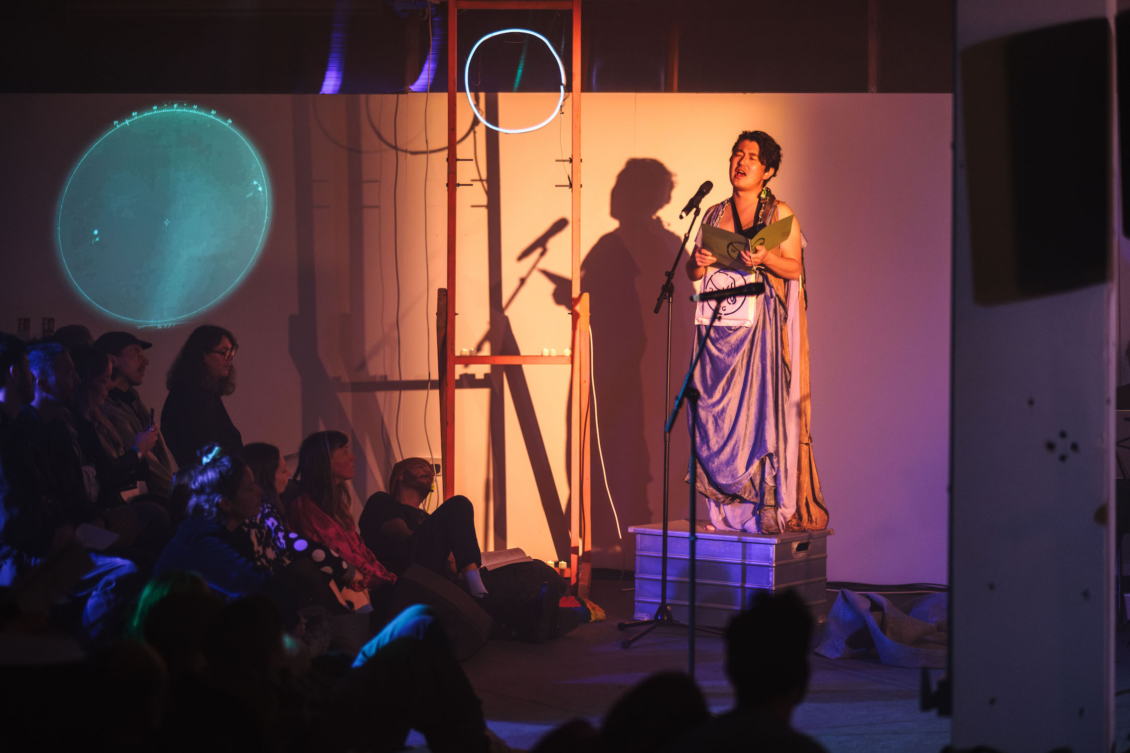On first entering the gallery at Soft Ground, the vast figure of a catfish deity – known as Namazu – greets me with toothsome smile, dark robes and absent eyes. It serves as a gatekeeper and guide through the exhibition, which is set out in a scholarly museum-like arrangement of slides, shelves and props from the earlier performance of the operatic oratorio. Excerpts of the performance fill the space – some a biblical lament, others a studious lecture on the nesting dolls of failed assassination attempts. My favourite piece of music comes in the form of a comically tragic 80s estate agent selling a beach view apartment that is under water. Each carefully arranged object and voice acts as a relic to a past, present or future cataclysm.