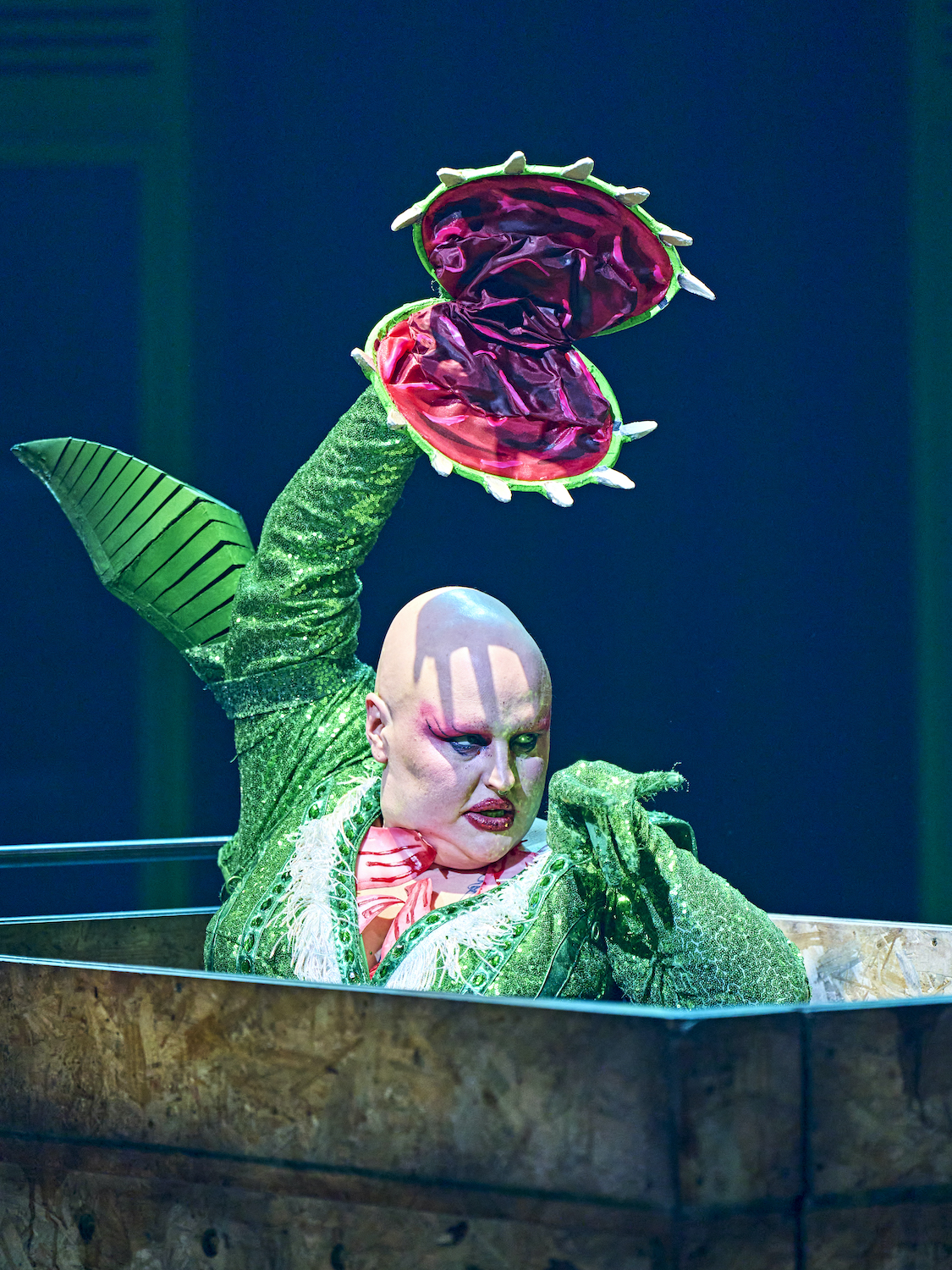 Add to this the ever-growing Audrey II (played by Sam Buttery, who serves sass by the bucket load). The increasingly hungry, monstrous plant is brought to life by a troupe of twisting vines and snapping Venus fly traps, creating a show that’s as visually mesmerising as it is delightfully chaotic.