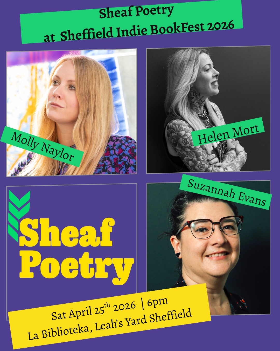 - Three Sheffield Poets: Helen Mort, Suzannah Evans, Molly Naylor, 6–8pm. All proceeds raising funds for future Sheaf events building (hopefully!) back up to a full festival in the future. Book now – suggested donation up to £7.