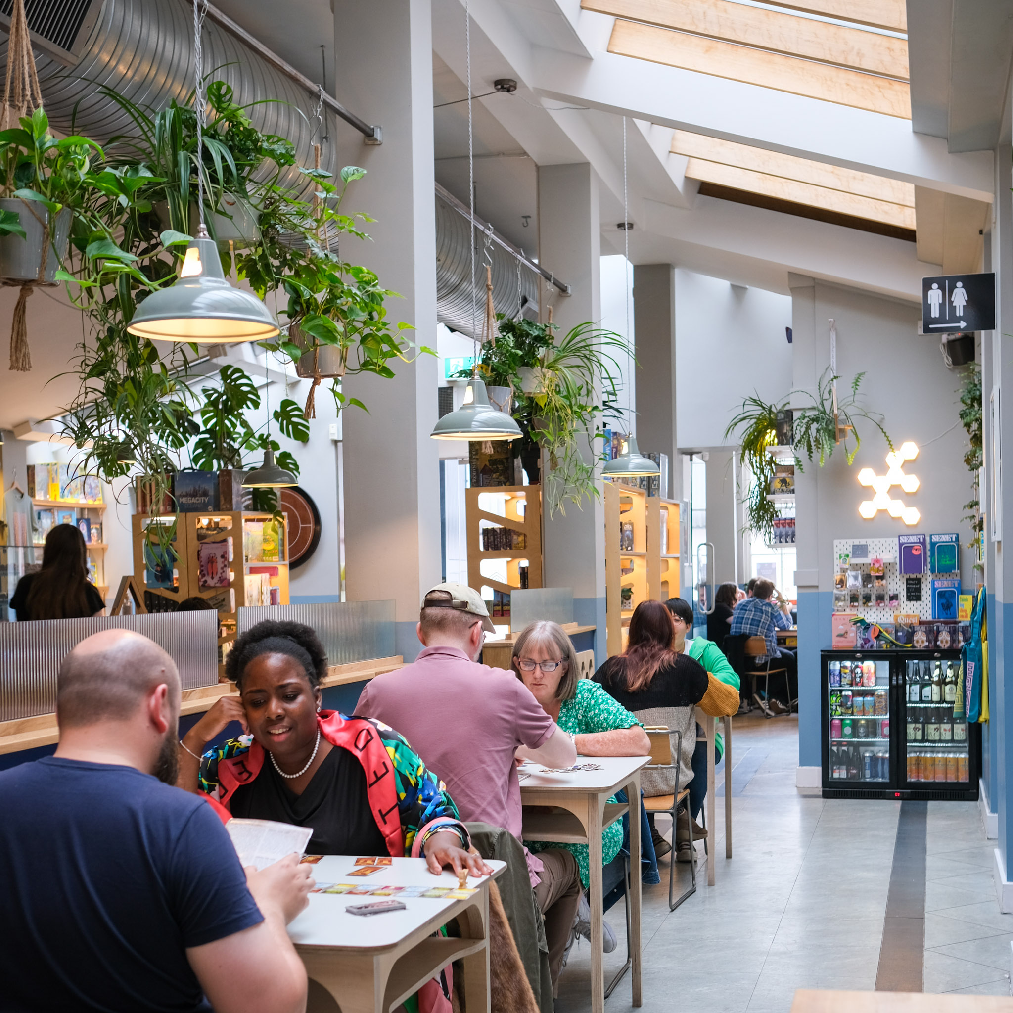 Iron girders arch over The Tramshed’s main room, where high floating tabletops and anglepoise-style light fittings stick out the walls opposite wooden bar shelves heaving with spirits. Lush greenery hangs from long gutter-type planters nearby and, in the fridges below, dozens of craft beers are waiting to be sampled.